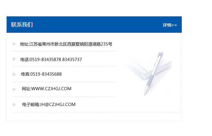 地址:常州市新北區友邦商務大廈1幢16、17層  電話:0519-85101652  傳真:0519-85112595  郵編:213022  網址:www_cz-jiayue_cn.mingdr.com  郵箱:xiajifengaa@163.com
